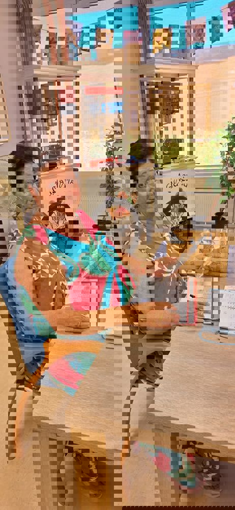 “Hoe ik ben begonnen bij Het Zonnelied”, herhaalt Jolande. “Nou, mijn dochter werkte bij De Lindeboom, het vroegere Zonnelied. Op een gegeven moment belde ze: "Mam, we hebben vakantiekrachten nodig.’ Ik werkte ook nog als schoonheidsspecialiste, dus ik wilde het in eerste instantie niet doen. Uiteindelijk heb ik toch ja gezegd op de vakantiebaan. Na zes weken invalwerk werd ik gebeld of ik boodschappen vanuit het winkeltje op locatie wilde rondbrengen naar de kamers van de bewoners. Dat vond ik hartstikke leuk en ik begon ook met het rondbrengen van het wasgoed. Na een tijdje kwam er een nieuwe manager en ze vroeg wat ik wilde doen op Het Zonnelied. Ik zei tegen haar ‘Ik wil daar zitten bij de receptie, want er zat geen receptie. Die donkere, lege hoek zag er niet uit!’. Een week later zat ik er.”