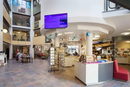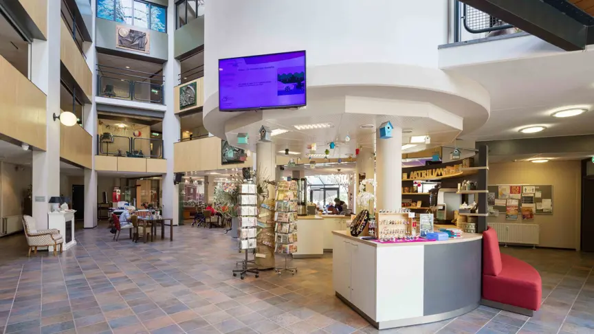Door aankleding met sfeerfoto’s en zithoekjes heeft elke etage in AAtrium een eigen sfeer. Vanaf de gangen op alle verdiepingen hebben bewoners een fraai uitzicht op de levendige dorpspleinachtige ontmoetingsruimte op de begane grond. Zo kunnen ze horen en zien wat er beneden gebeurt. En daar is altijd wat te beleven.