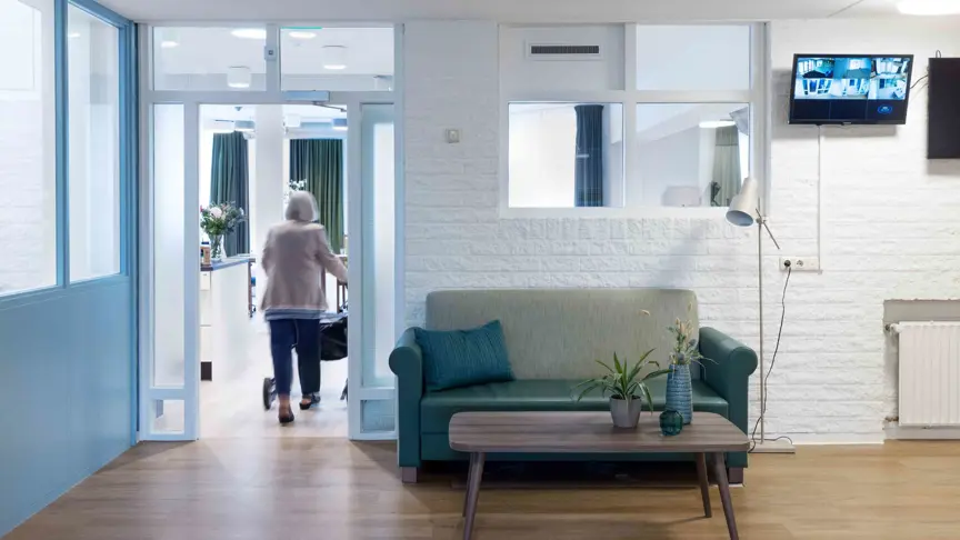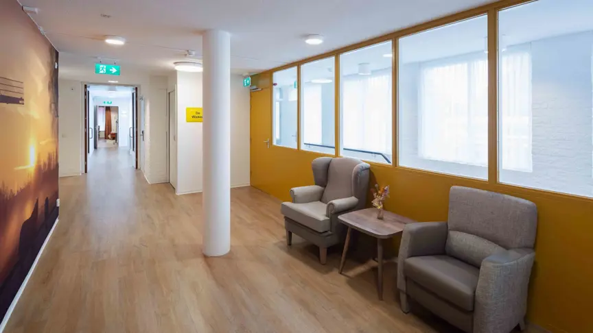 Op de begane grond wonen ouderen die vanwege lichamelijke problemen niet meer zelfstandig kunnen wonen. Er is een mooie binnentuin met vogels en een groot terras. De eerste verdieping is gereserveerd voor ouderen met dementie. Zij beschikken over een riant dakterras. Zo nodig zetten we slimme technologie in, zodat iedereen zich veilig en vrij in en om het gebouw kan bewegen.